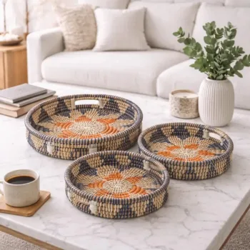 Beautifully handwoven with sustainable kansgrass and subtle multicolor accents, this artisan tray set reflects a perfect balance of tradition, function, and design. Each piece is crafted by skilled women artisans using time-honored techniques, bringing natural texture and authentic character into your home. Designed to be both decorative and practical, these trays elevate everyday moments, whether used for serving, organizing, or styling, while adding warmth and depth to any interior. More than décor, this set represents conscious living, thoughtful craftsmanship, and a meaningful connection between handmade beauty and modern homes.